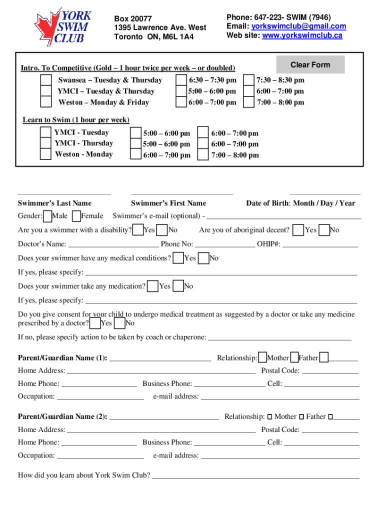 Phone: 647223 SWIM (7946) Email: yorkswimclub gmail.com Website: www.yorkswimclub.caBox 20077 1395 Lawrence Ave. West Toronto ON, M6L 1A4Clear Forming. To Competitive (Gold 1 hour twice per week or
