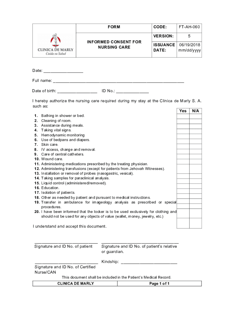 FORM CODE: FTAH060 VERSION: INFORMED CONSENT FOR NURSING CARE 5 ISSUANCE 06/19/2018 DATE: mm/dd/YYY Date: Full name: Date of birth: ID No.: I hereby authorize the nursing care required during my stay