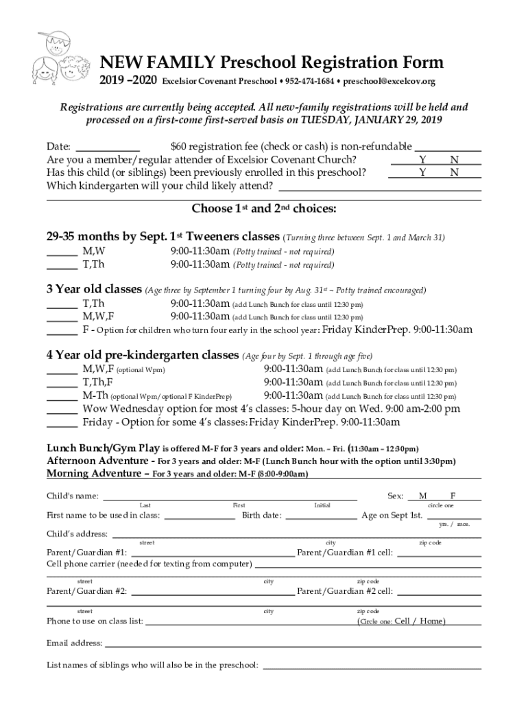 NEW FAMILY Preschool Registration Form 2019 2020Excelsior Covenant Preschool 9524741684 preschool excelled. Registrations are currently being accepted. All new family registrations will be held and