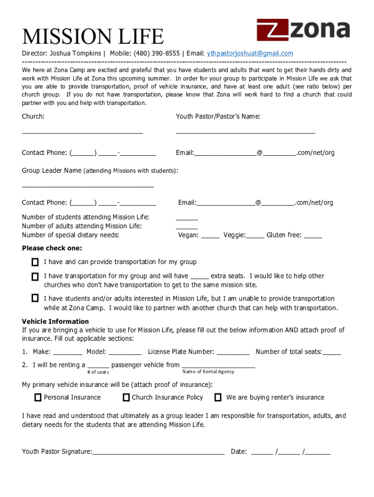 MISSION LIFE Director: Joshua Tompkins Mobile: (480) 3908555 Email: ythpastorjoshuat Gmail. Come here at Zone Camp are excited and grateful that you have students and adults that want to get their
