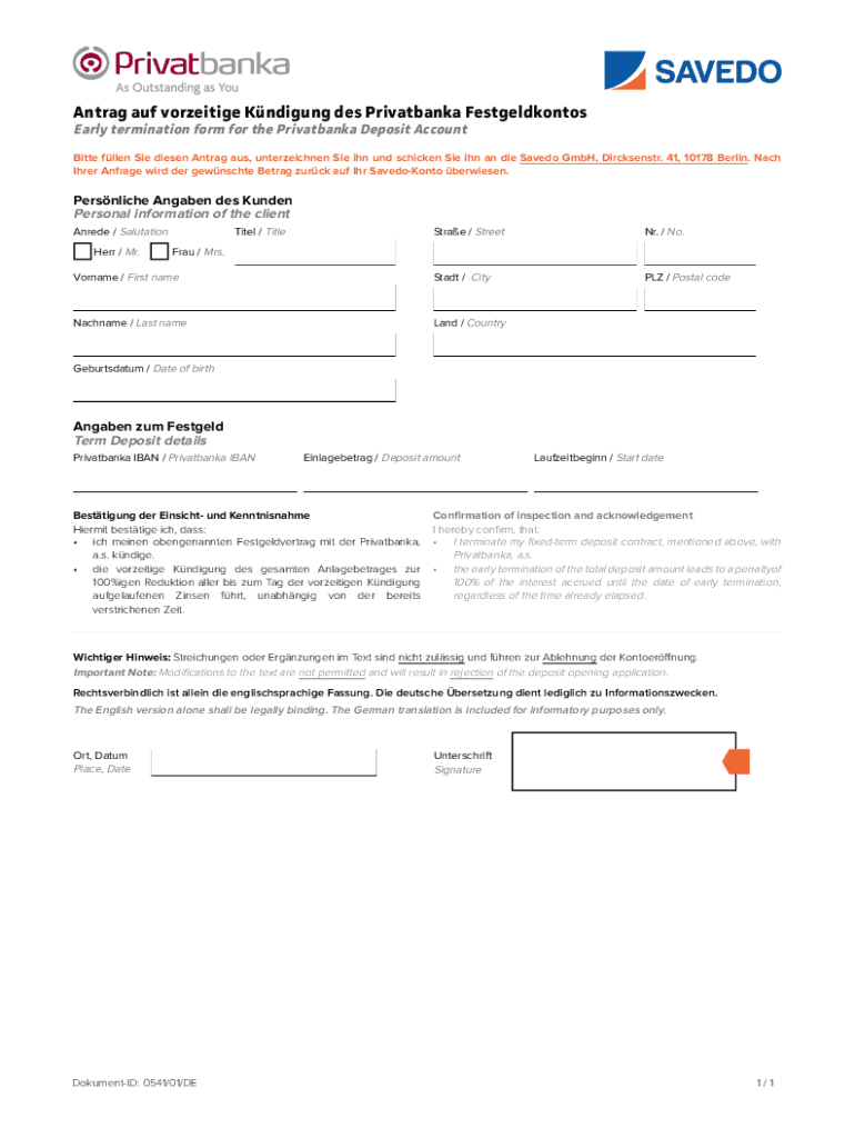 Early termination form for the Privatbanka Deposit AccountBitte fallen She diesels Ant rag AUS, unterzeichnen She in UND chicken She in