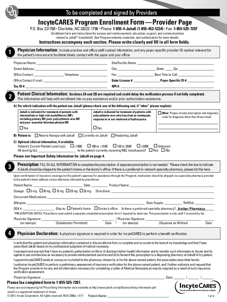 To be completed and signed by ProvidersIncyteCARES Program Enrollment FormProvider Page. O. Box 221798 Charlotte, NC 282221798 Phone: 18554Jakafi (18554525234) Fax: 18555257207 Enrollment form and