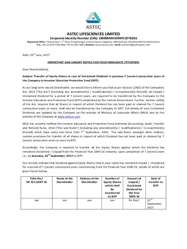 AZTEC BIOSCIENCES LIMITEDCorporate Identity Number (IN): L99999MH1994PLC076236Registered Office: Gore One, 3rd Floor, Pirojshanagar, Eastern Express Highway, Victrola (East), Mumbai400079, Maharashtra