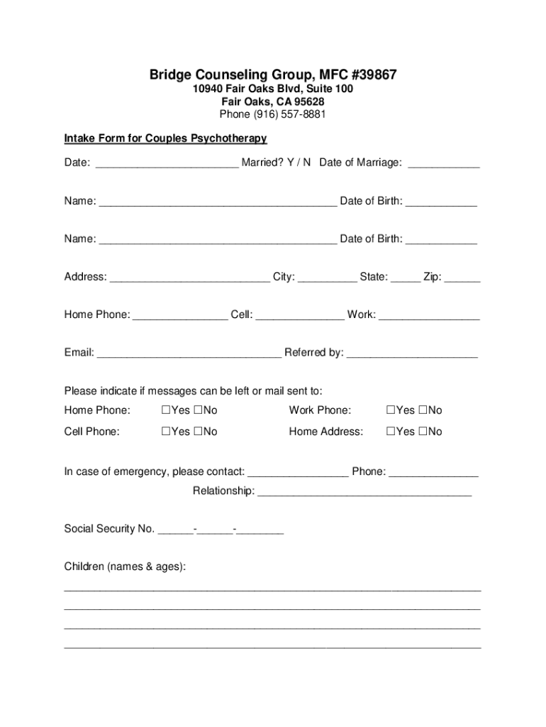 Bridge Counseling Group, MFC #39867 10940 Fair Oaks Blvd, Suite 100 Fair Oaks, CA 95628 Phone (916) 5578881 Intake Form for Couples Psychotherapy Date: Married? Y / N Date of Marriage: Name: Date