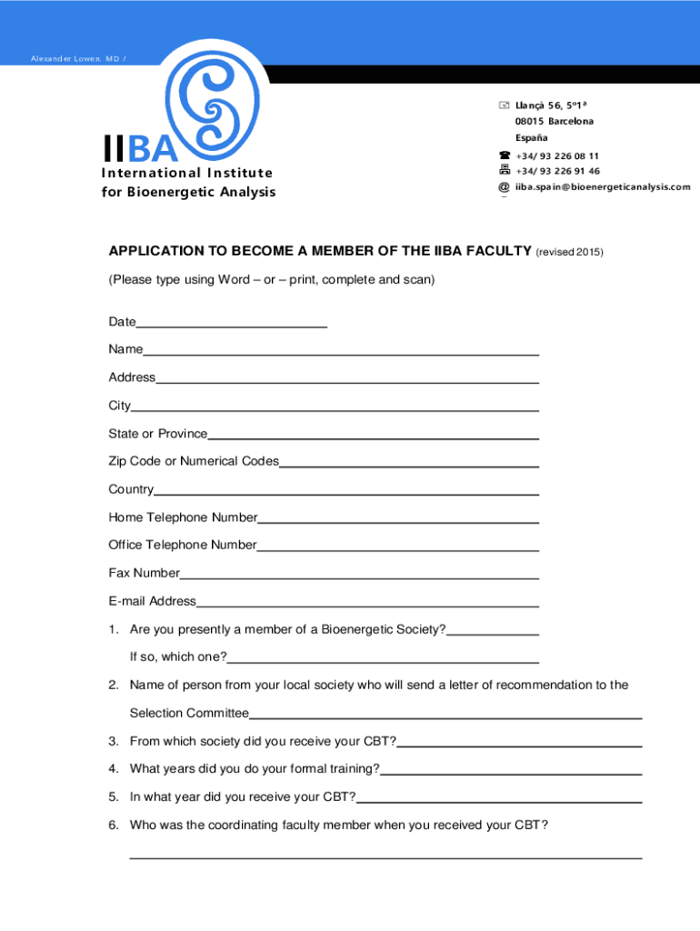 Alexander Lower, MD / Plan 56, 51IIBAInternational Institute for Bioenergetics Analysis08015 Barcelona ESAA +34/ 93 226 08 11 +34/ 93 226 91 46 IBA. Spain bioenergeticanalysis.com www.bioenergetictherapy.comAPPLICATION