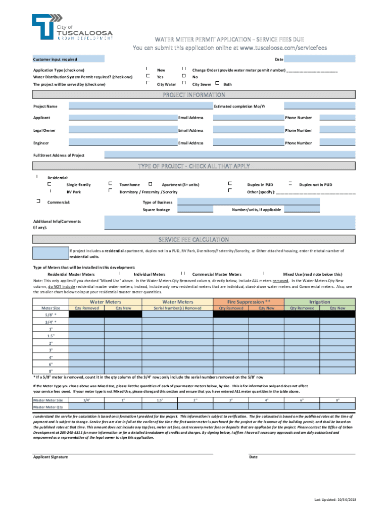 WATER METER PERMIT APPLICATION SERVICE FEES DUE You can submit this application online at www.tuscaloosa.com/servicefees Customer input requiredDateApplication Type (check one)Exchange Order (provide