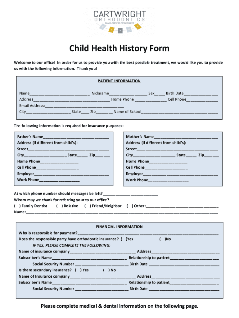 Child Health History FormWelcome to our office! In order for us to provide you with the best possible treatment, we would like you to provides with the following information. Thank you!PATIENT Informational
