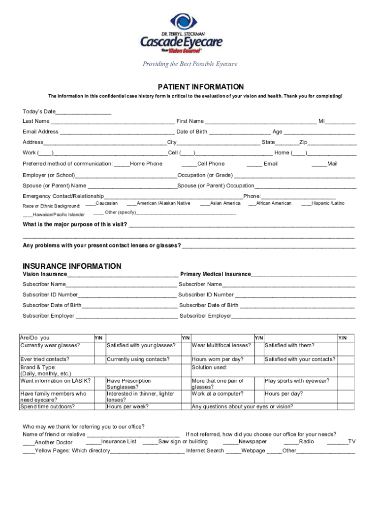 Providing the Best Possible EyecarePATIENT INFORMATION The information in this confidential case history form is critical to the evaluation of your vision and health. Thank you for completing! Today's