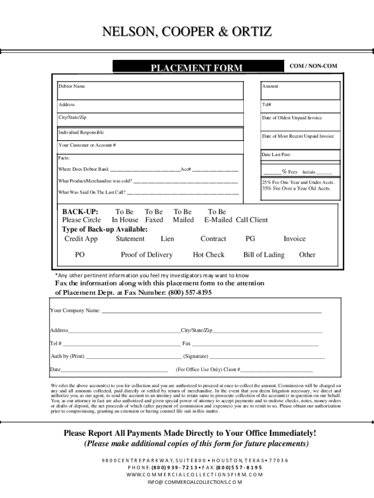 Get the free NELSON, COOPER & ORTIZ. DOWNLOAD PLACEMENT FORM