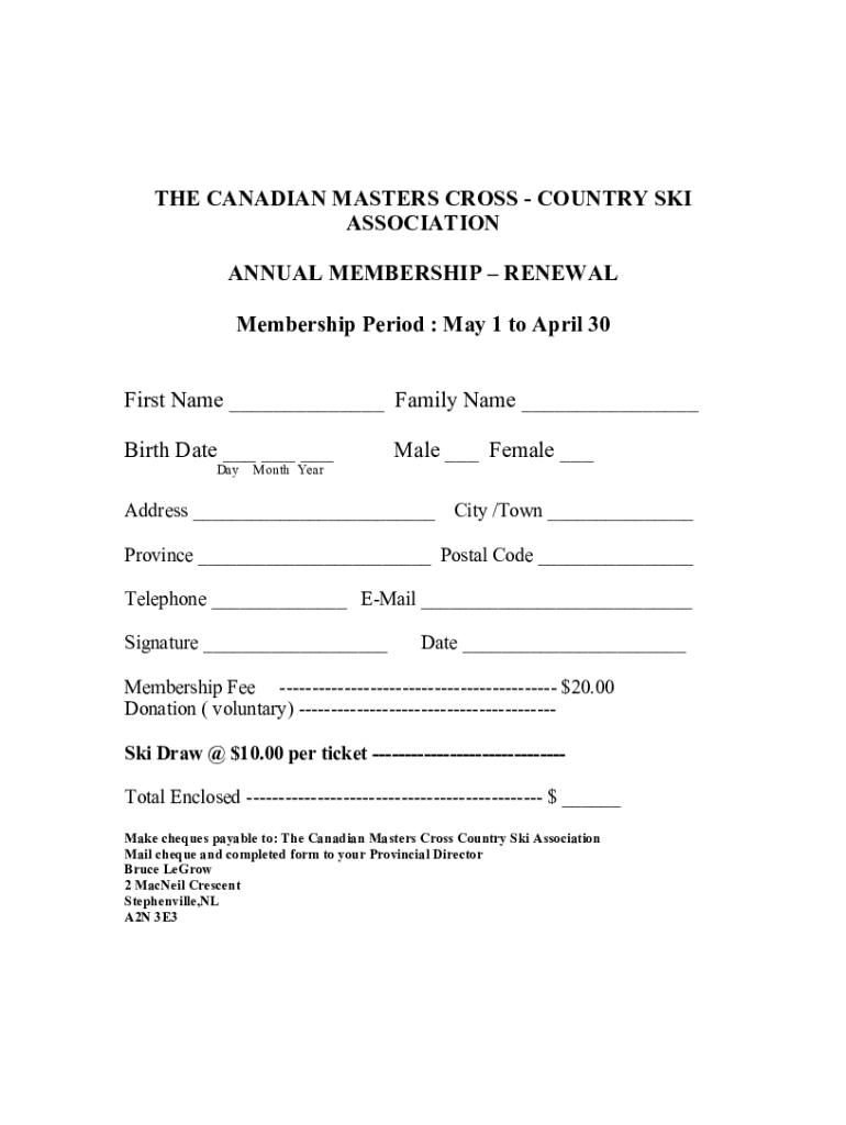 THE CANADIAN MASTERS CROSS COUNTRY SKI ASSOCIATION ANNUAL MEMBERSHIP RENEWAL Membership Period : May 1 to April 30 First Name Family Name Birth Date Day Month Year Male Female Address City /Town Province