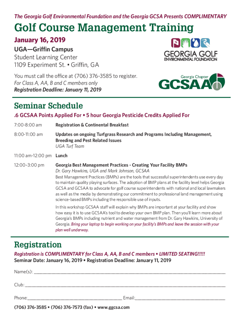 The Georgia Golf Environmental Foundation and the Georgia CSA Presents COMPLIMENTARYGolf Course Management Training January 16, 2019, UGA Griffin Campus Student Learning Center 1109 Experiment St.