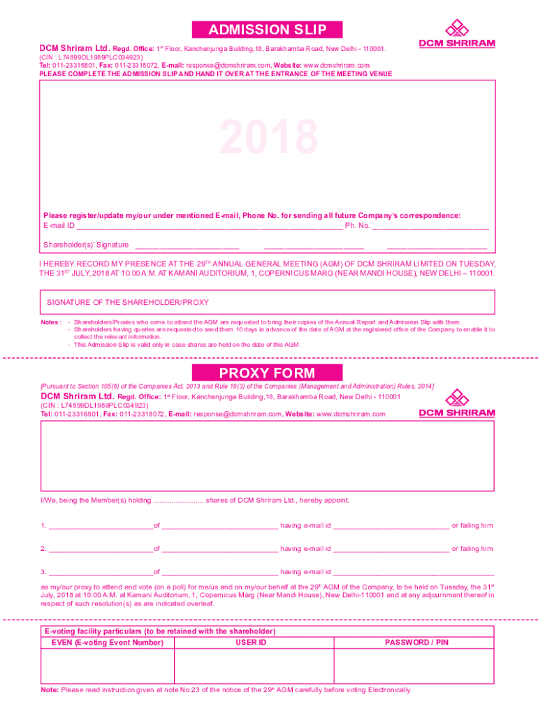 ADMISSION SLIP DCM Sriram Ltd. Red. Office: 1st Floor, Kanchenjunga Building,18, Barakhamba Road, New Delhi 110001.(IN : L74899DL1989PLC034923) Tel: 01123316801, Fax: 01123318072, Email: response