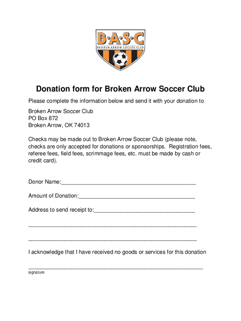 Donation form for Broken Arrow Soccer Club Please complete the information below and send it with your donation to Broken Arrow Soccer Club PO Box 872 Broken Arrow, OK 74013 Checks may be made out