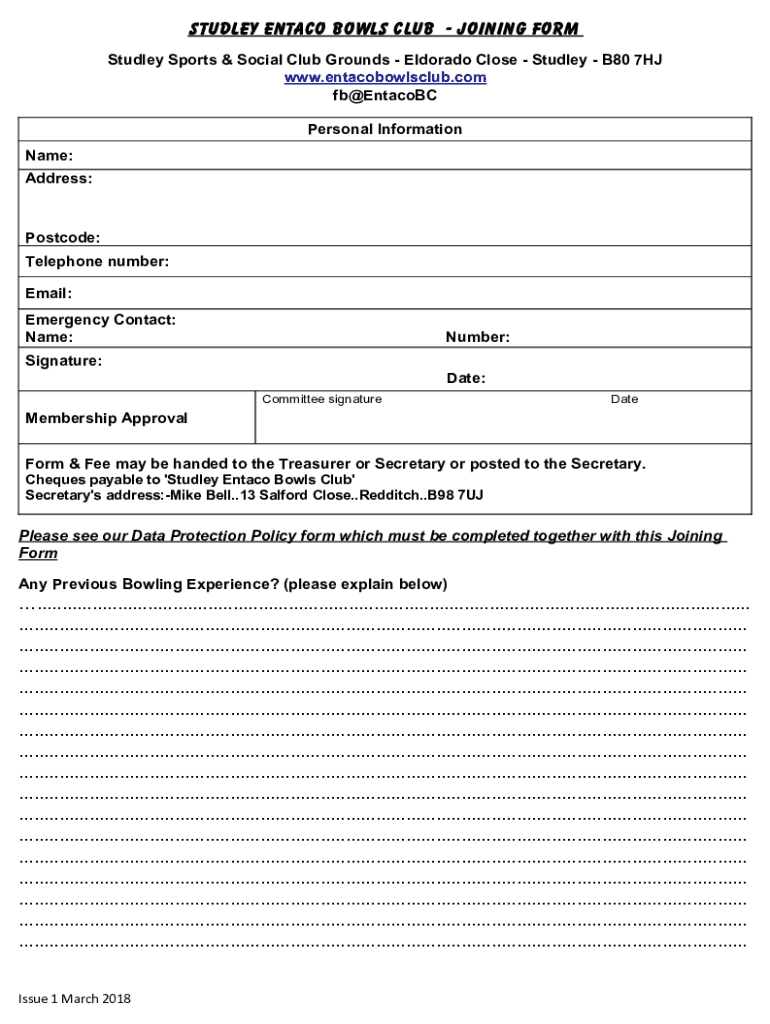 STUDLY En taco Bowls Club Joining Form Studly Sports & Social Club Grounds El Dorado Close Studly B80 7HJ www.entacobowlsclub.com FB EntacoBC Personal Information Name: Address:Postcode: Telephone