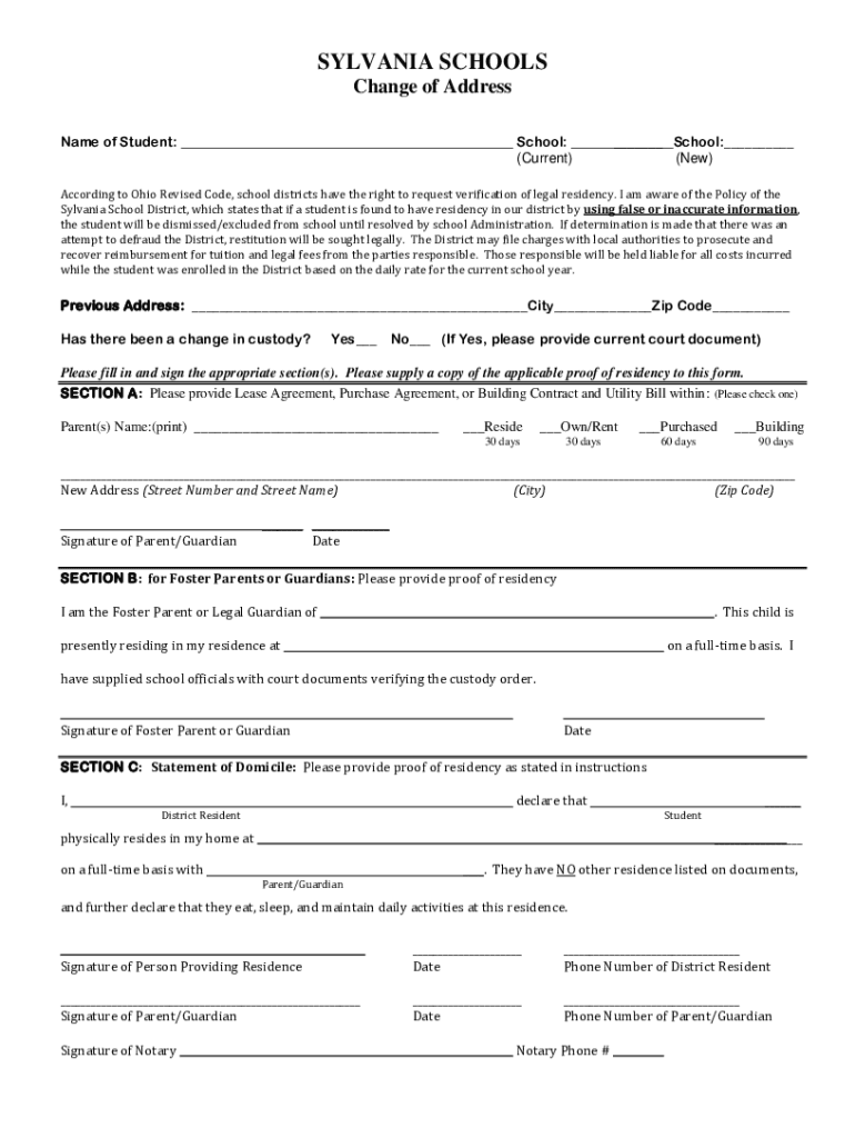 SYLVAN IA SCHOOLS Change of Address Name of Student:School: (Current) School: (New)According to Ohio Revised Code, school districts have the right to request verification of legal residency. I am