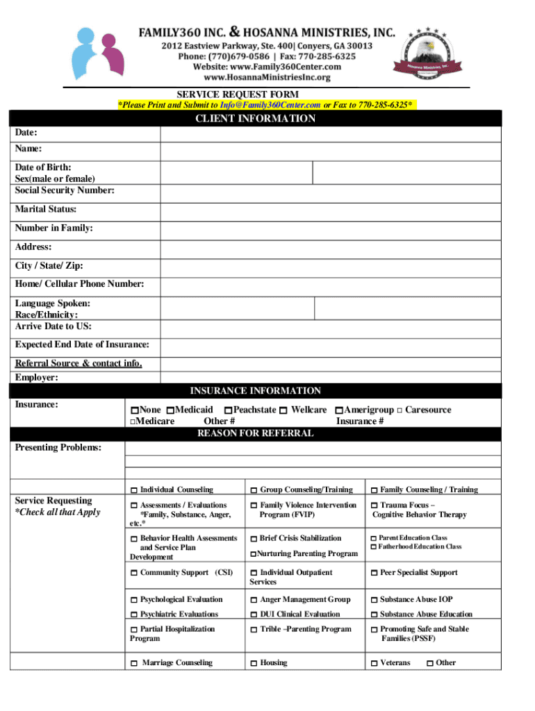 SERVICE REQUEST FORM *Please Print and Submit to Info Family360Center.com or Fax to 7702856325×CLIENT INFORMATION Date: Name: Date of Birth: Sex(male or female) Social Security Number: Marital Status: