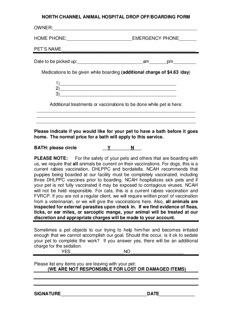 NORTH CHANNEL ANIMAL HOSPITAL DROP OFF/BOARDING FORM OWNER: HOME PHONE: EMERGENCY PHONE PETS NAME Date to be picked up: am pm Medications to be given while boarding (additional charge of $4.63 /day)