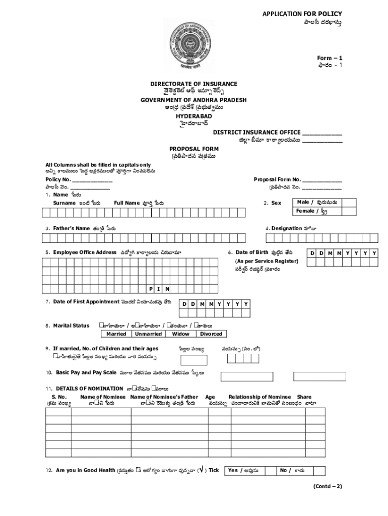 APPLICATION FOR POLICYFyqs RLRixqsVForm 1FnyLRiLi c 1DIRECTORATE OF INSURANCE lLiNRPlLi MSN BsWlLisGOVERNMENT OF ANDHRA PRADESHALiR XMS a P XMS VR×SVP HYDERABAD RLS DISTRICT INSURANCE OFFICE NSW