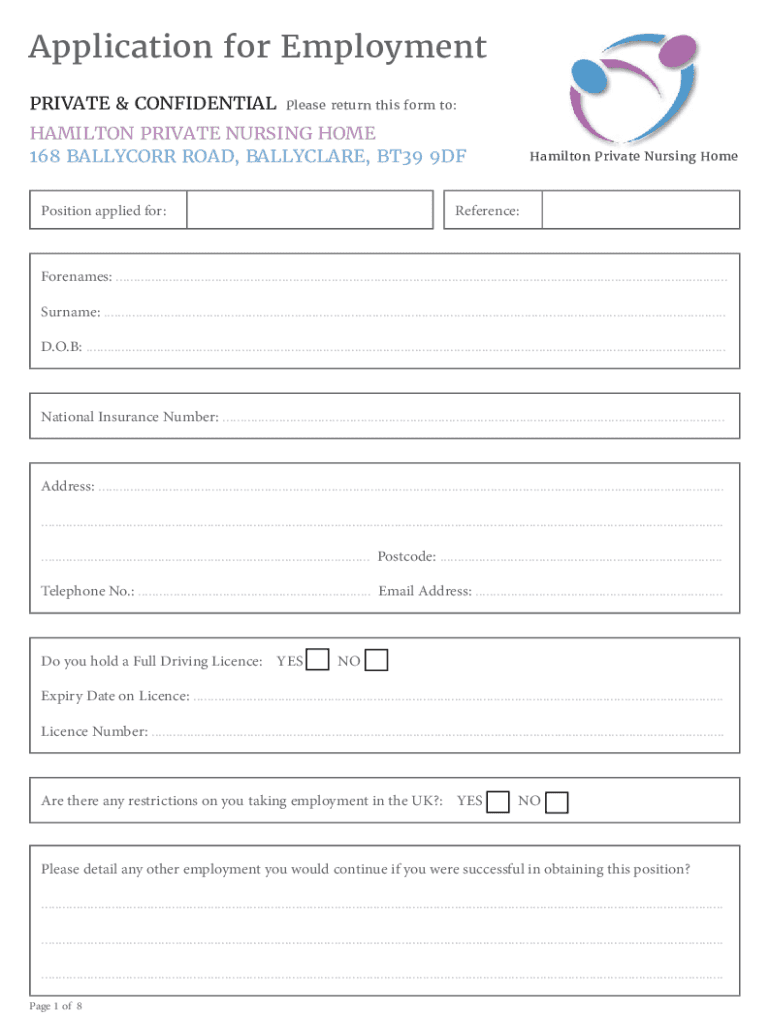 Application for Employment PRIVATE & CONFIDENTIALPlease return this form to:HAMILTON PRIVATE NURSING HOME 168 BALLYHOO ROAD, BALLYARD, BT39 9DF Position applied for:Hamilton Private Nursing HomeReference:Forenames: