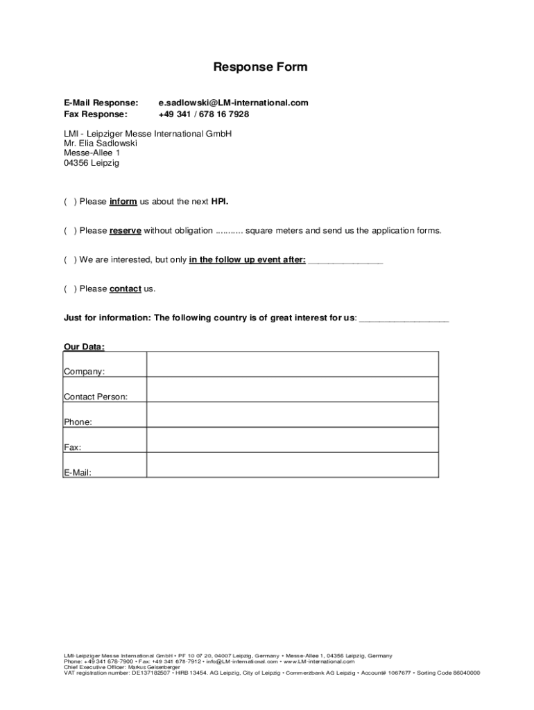 Response Form Email Response: Fax Response:e. Wazowski LMinternational.com +49 341 / 678 16 7928LMI Leipzig her Jesse International GmbH Mr. Elias Wazowski MesseAllee 1 04356 Leipzig() Please inform
