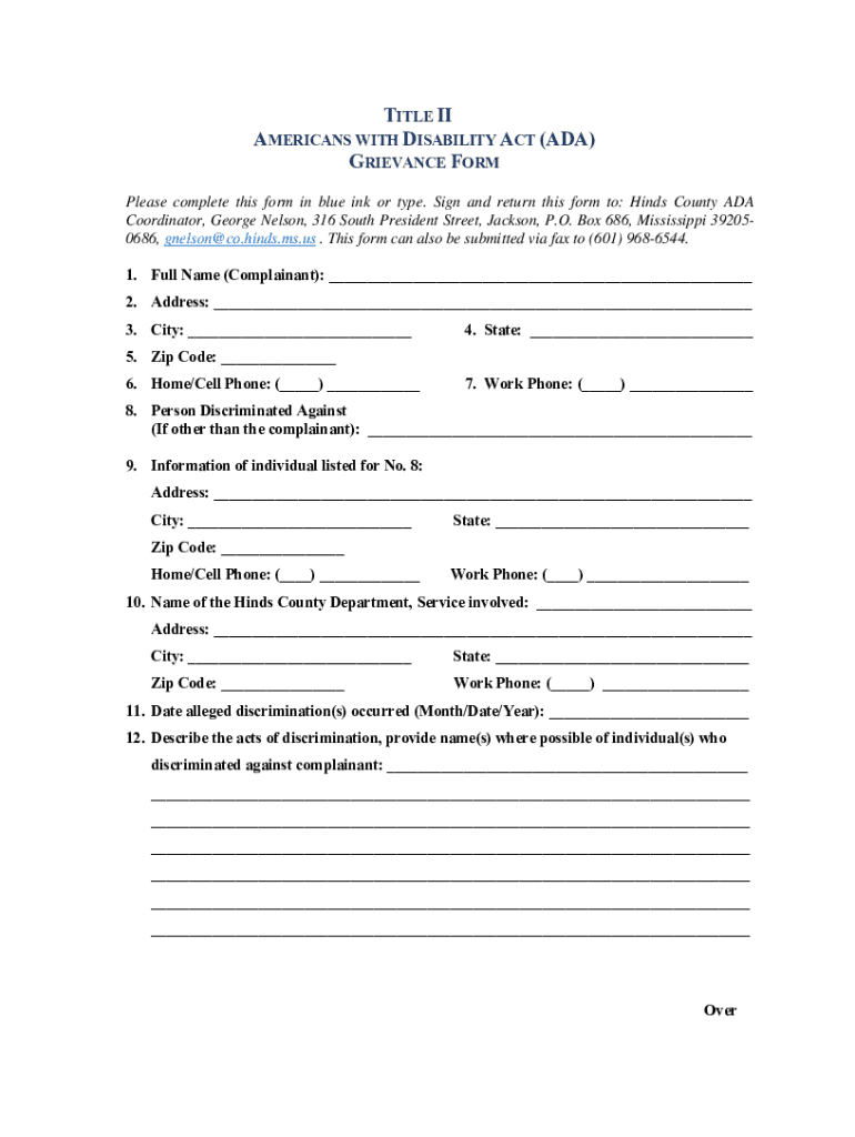 TITLE II AMERICANS WITH DISABILITY ACT (ADA) GRIEVANCE FORM Please complete this form in blue ink or type. Sign and return this form to: Hinds County ADA Coordinator, George Nelson, 316 South President