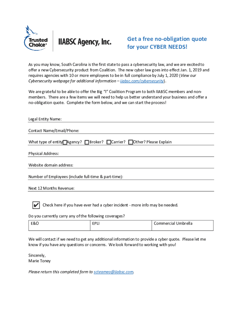 Get a free no obligation quote for your CYBER NEEDS! As you may know, South Carolina is the first state to pass a cybersecurity law, and we are excited to offer a new Cybersecurity product from Coalition.