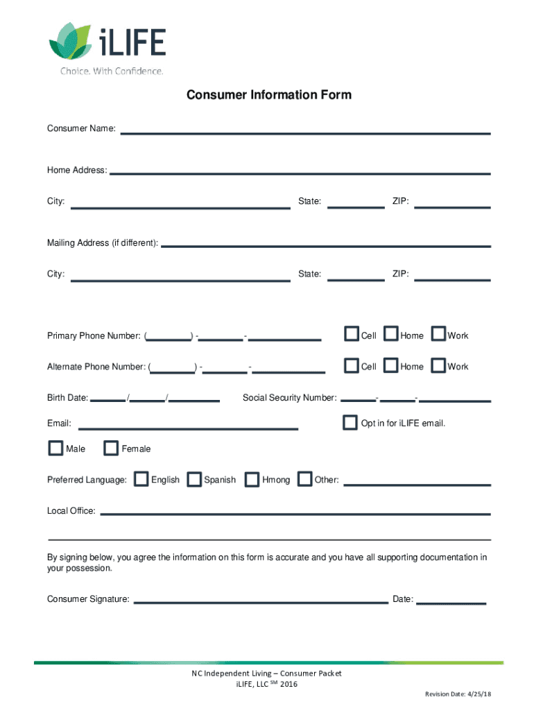 Consumer Name:Home Address:City:State:ZIP:State:ZIP:Mailing Address (if different):City:Primary Phone Number: ()Alternate Phone Number: (Birth Date:/)/Social Security Number:Email: