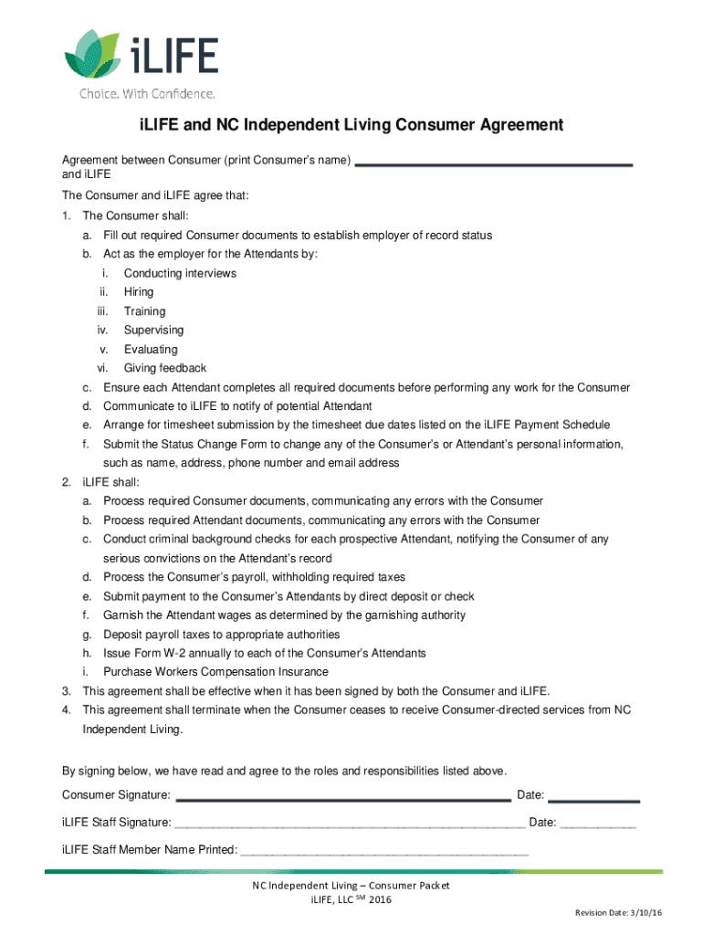 LIFE and NC Independent Living Consumer Agreement between Consumer (print Consumers name)
