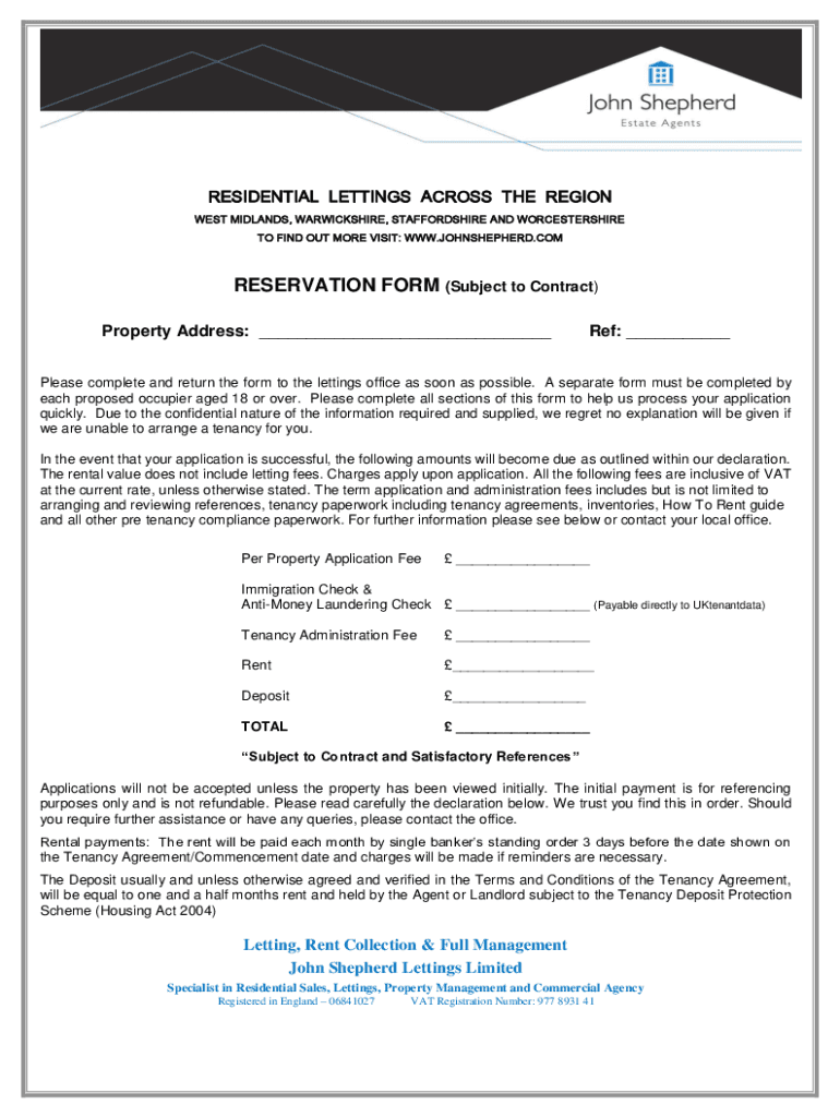RESIDENTIAL LETTINGS ACROSS THE REGION WEST MIDLANDS, WARWICKSHIRE, STAFFORDSHIRE AND WORCESTERSHIRE TO FIND OUT MORE VISIT: WWW.JOHNSHEPHERD.CONSERVATION FORM (Subject to Contract) Property Address:
