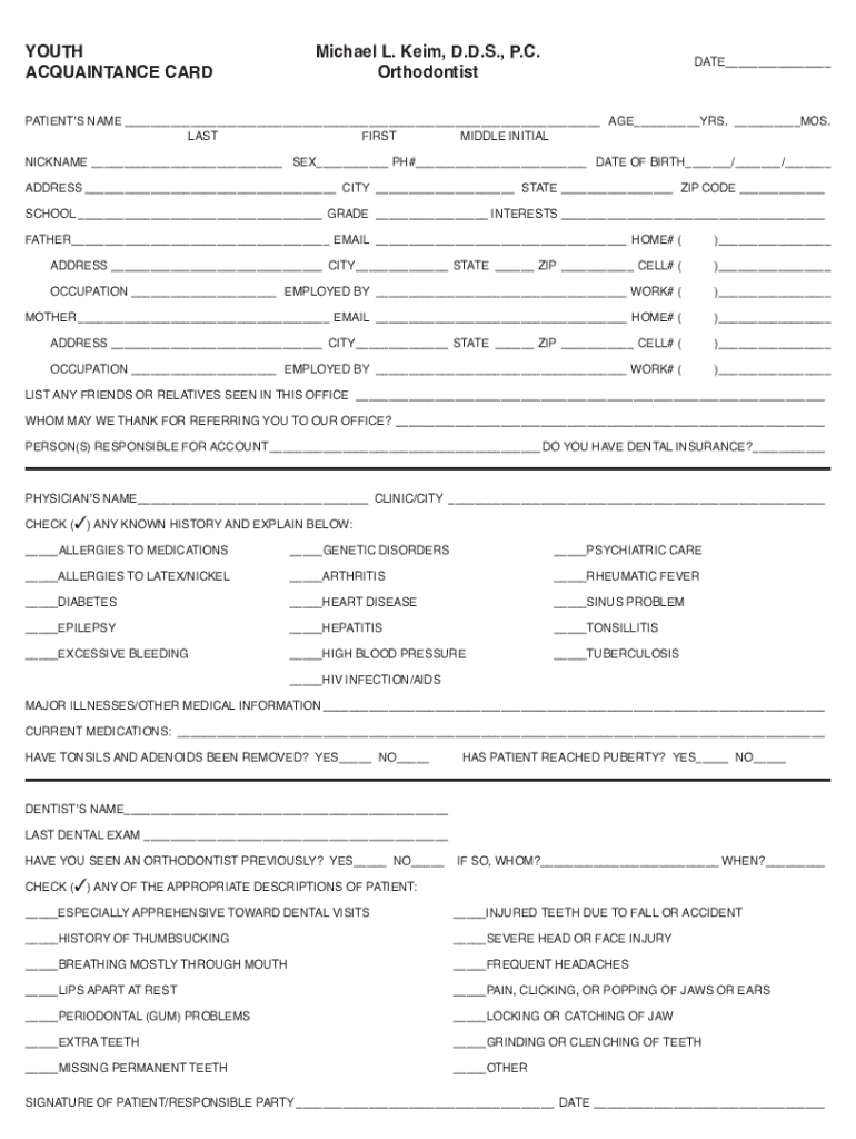 Youth Acquaintance Carmichael L. Sam, D.D.S., P.C. orthodontistDate Patients name age Yrs. Mos. Last First middle initial nickname sex PH# Date OF Birth / / address City state Zip Code school grade