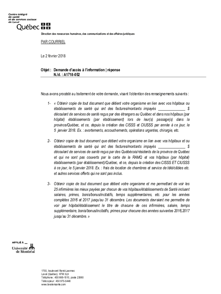 Direction DES resources humans, DES communications et DES affairs juridiquesPAR COURIER Le 2 frier 2018 Object : Demand daces information response N./d. A1718052Nous Avon proud AU treatment DE vote