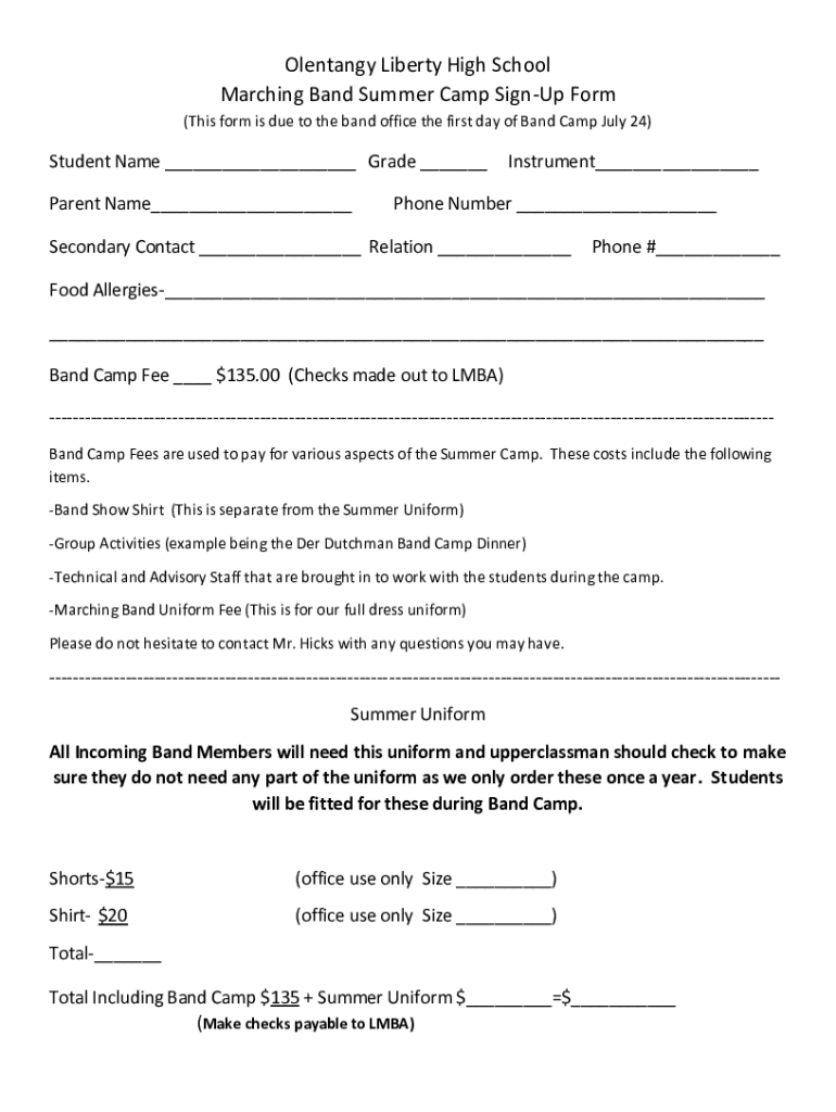 Olen tangy Liberty High School Marching Band Summer Camp Sign-up Form (This form is due to the band office the first day of Band Camp July 24)Student Name Grade Parent Name Instrument Phone Number