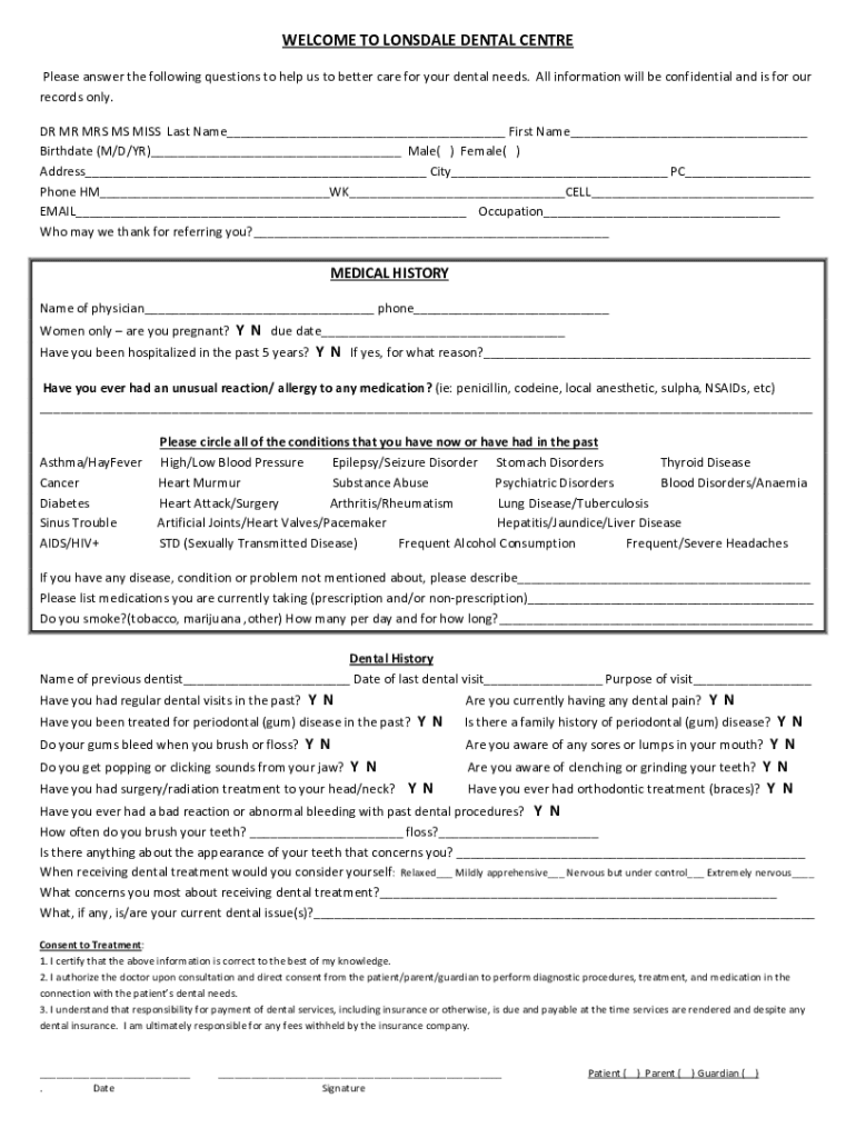 WELCOMETOLONSDALEDENTALCENTRE Pleaseanswerthefollowingquestionstohelpustobettercareforyourdentalneeds. Allinformationwillbeconfidentialandisforour records only.DRMRMRSMSMISSLastName Filename Birthdate’M/D/YR)
