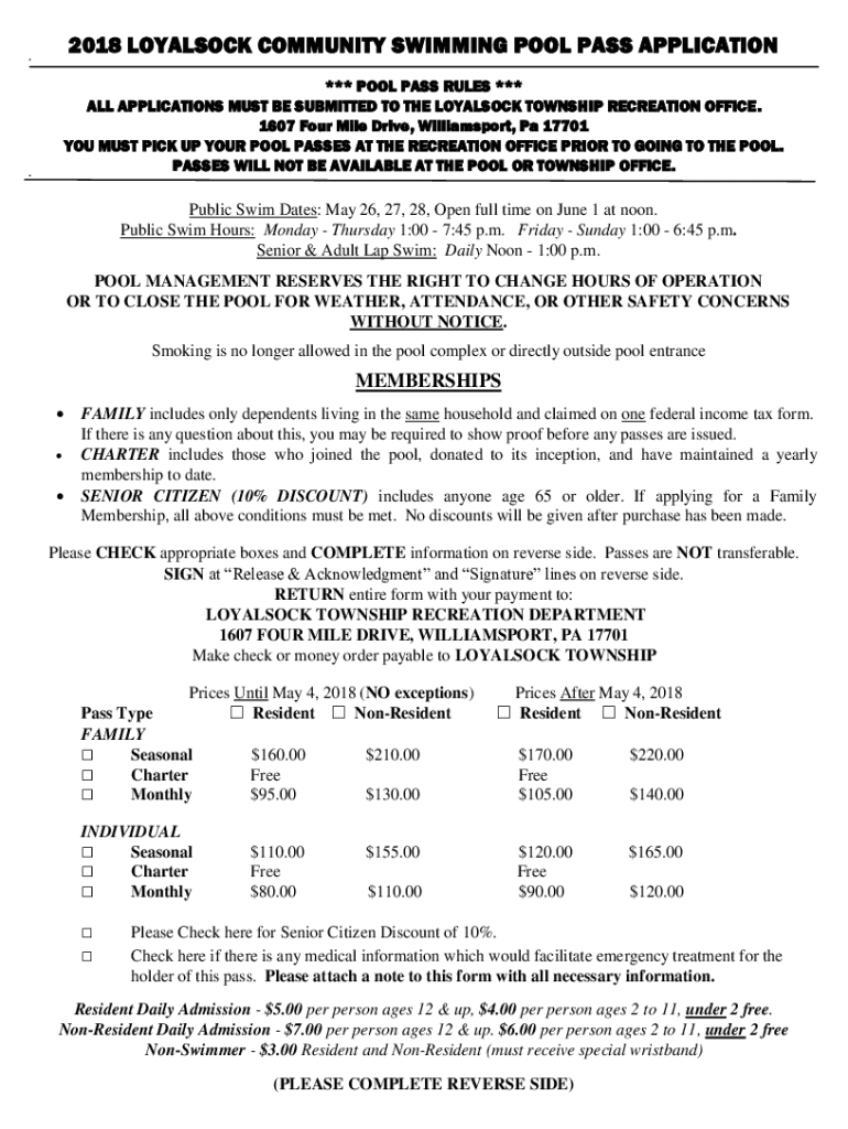 2018 LOYALSOCK COMMUNITY SWIMMING POOL PASS APPLICATION *** POOL PASS RULES *** ALL APPLICATIONS MUST BE SUBMITTED TO THE LOYALSOCK TOWNSHIP RECREATION OFFICE. 1607 Four Mile Drive, Williamsport,