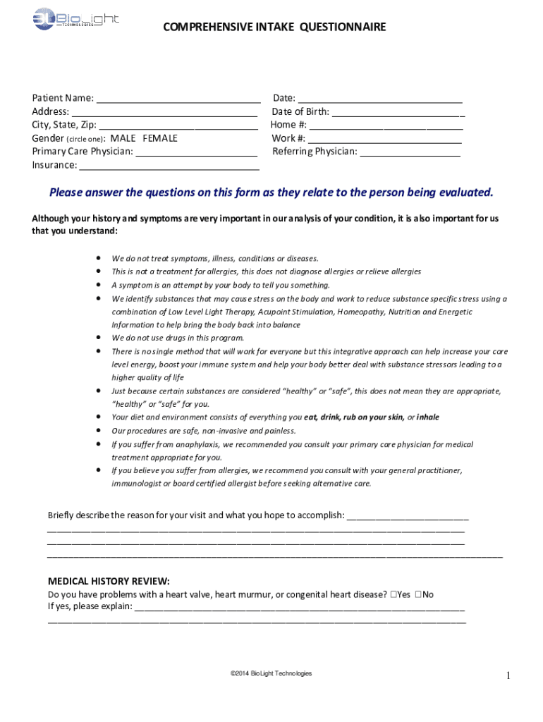 COMPREHENSIVE INTAKE QUESTIONNAIREPatient Name: Date: Address: Date of Birth: City, State, Zip: Home #: Gender (circle one): MALE FEMALE Work #: Primary Care Physician: Referring Physician: Insurance: