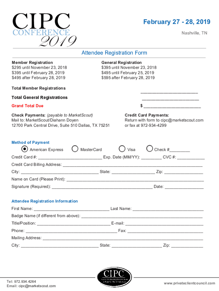 February 27 28, 20192019 Member Registration $295 until November 23, $2018395 until February 28, $2019495 after February 28, 2019Nashville, Unattended Registration Form General Registration $395 until