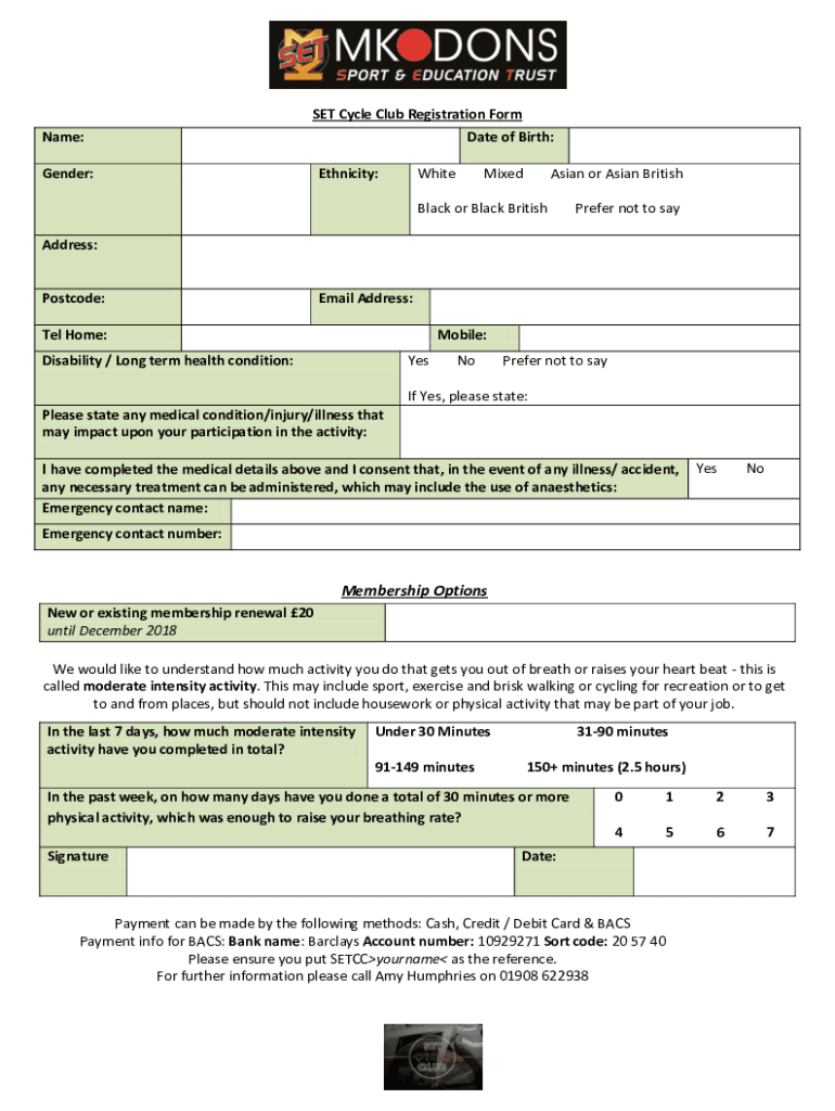 SET Cycle Club Registration Form
