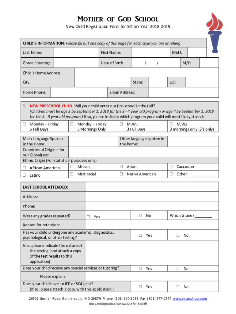 Mother of God School New Child Registration Form for School Year 20182019CHILDS INFORMATION: Please fill out one copy of this page for each child you are enrolling Last Name:First Name:Grade Entering:Date