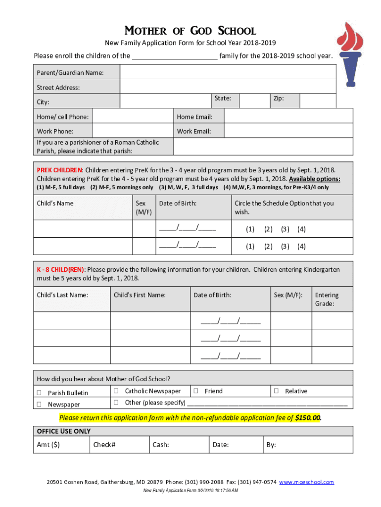 Mother of God School New Family Application Form for School Year 20182019 Please enroll the children of the family for the 20182019 school year. Parent/Guardian Name: Street Address: State:City: Home/