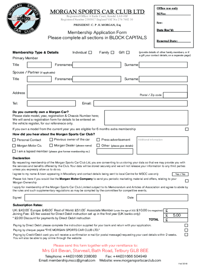 MORGAN SPORTS CAR CLUB LTD, Court, Kendal LA9 4SF Registered Office: 6 Earle Registered Number 2595917 England VAT No 276 7602 30Membership Application Form Please complete all sections in BLOCK CAPITALS