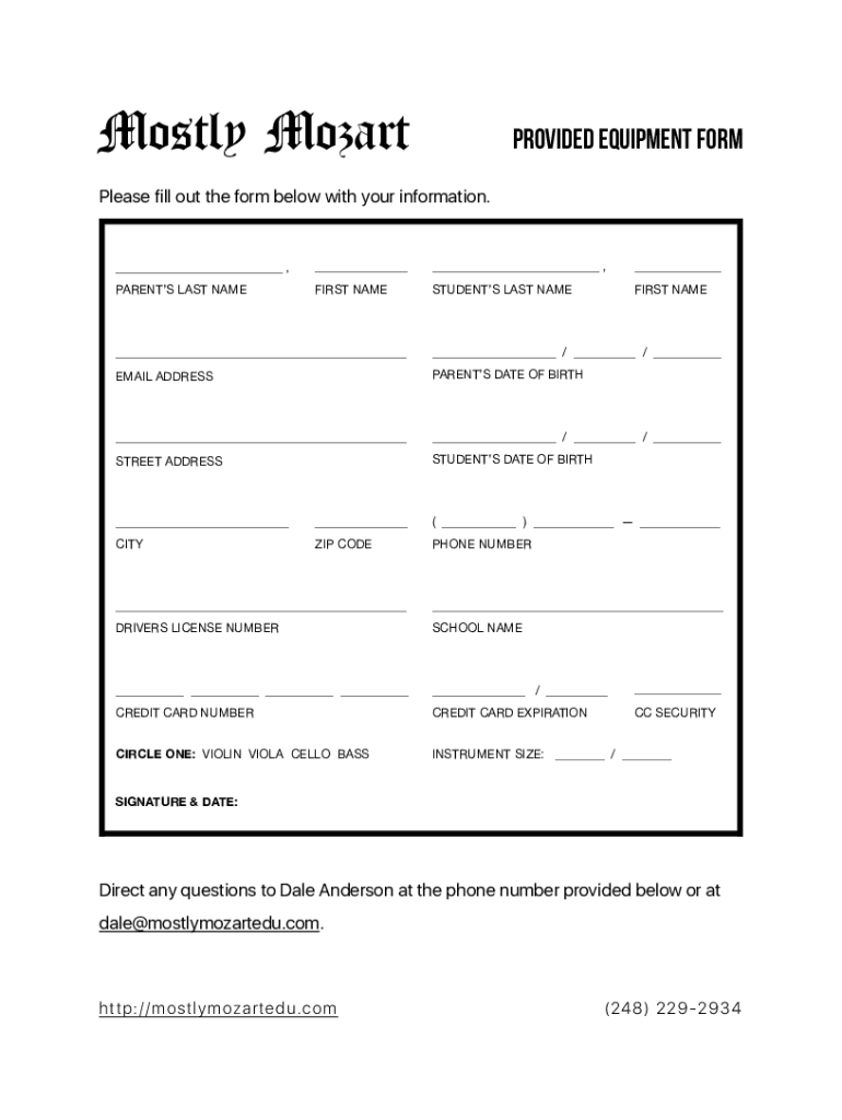 Mostly MozartProvided Equipment Formulas fill out the form below with your information. , PARENTS LAST NAMEFIRST NAMESTUDENTS LAST NAMEFIRST NAME / / EMAIL ADDRESSPARENTS DATE OF BIRTH / / STREET