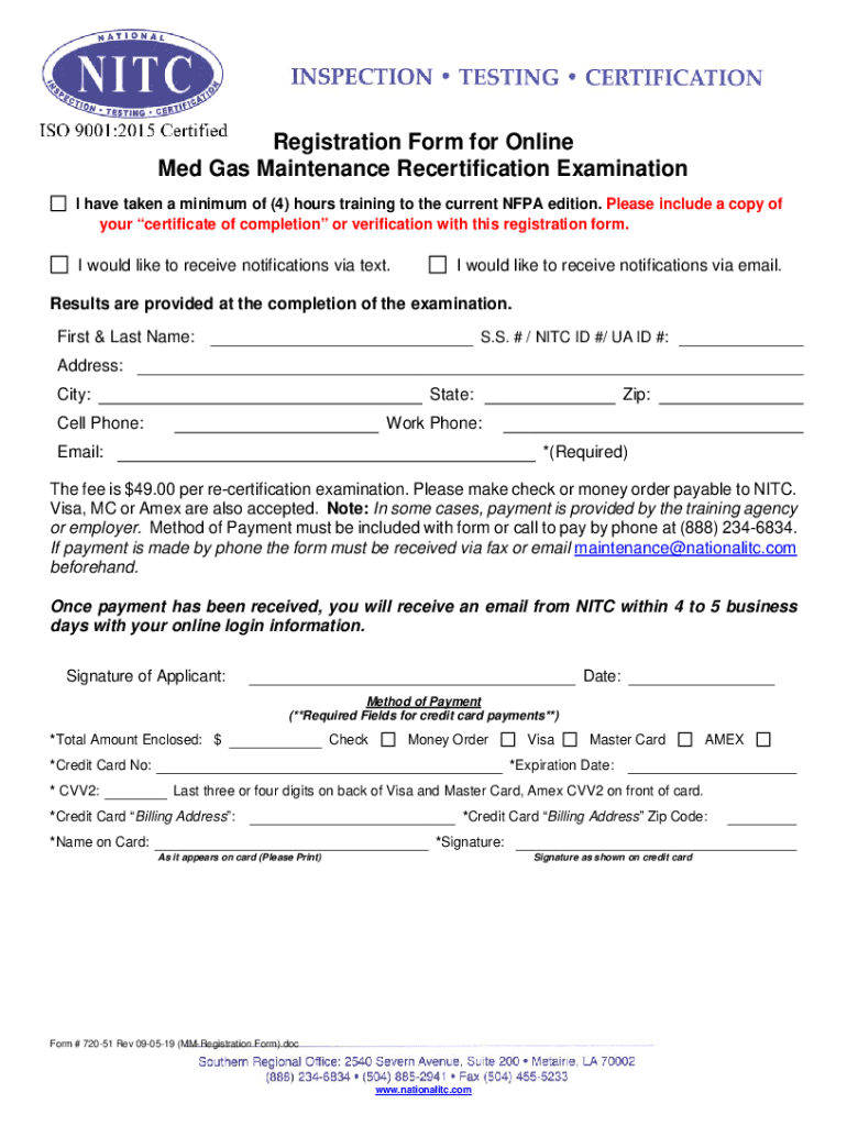 Registration Form for Online Med Gas Maintenance Recertification Examination I have taken a minimum of (4) hours training to the current NFPA edition. Please include a copy of your certificate of