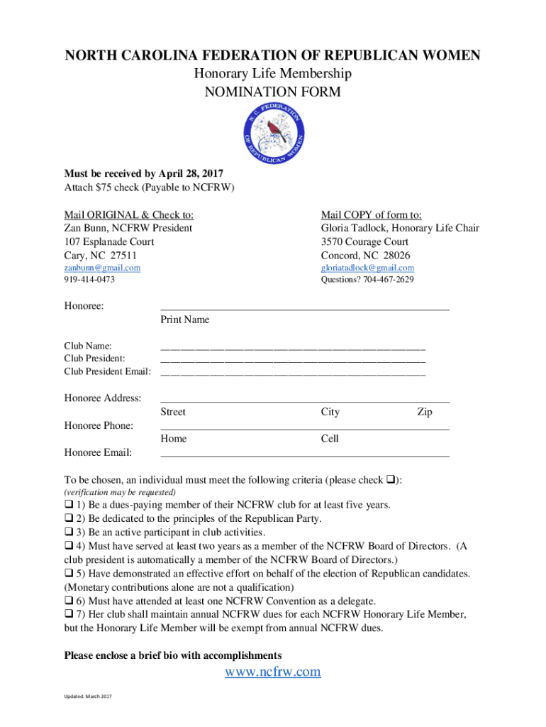 NORTH CAROLINA FEDERATION OF REPUBLICAN WOMEN Honorary Life Membership NOMINATION Foremost be received by April 28, 2017, Attach $75 check (Payable to CFR) Mail ORIGINAL & Check to: An Burn, CFR President