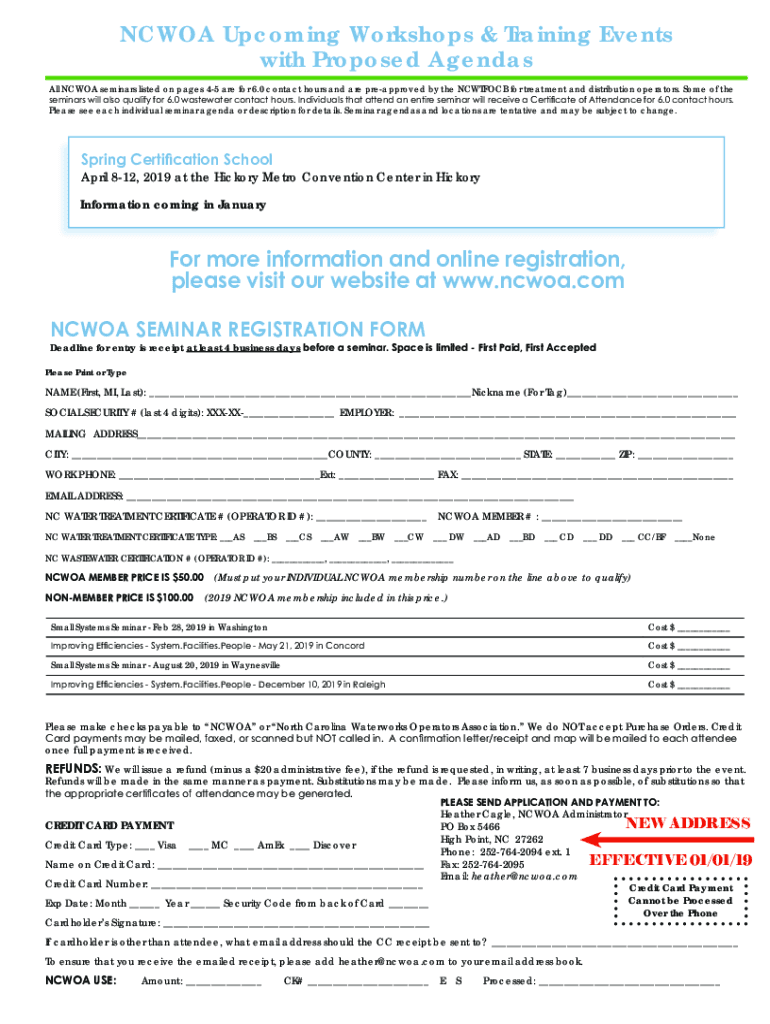 NCAA Upcoming Workshops & Training Events with Proposed Agendas All NCAA seminars listed on pages 45 are for 6.0 contact hours and are preapproved by the NCWTFOCB for treatment and distribution operators.