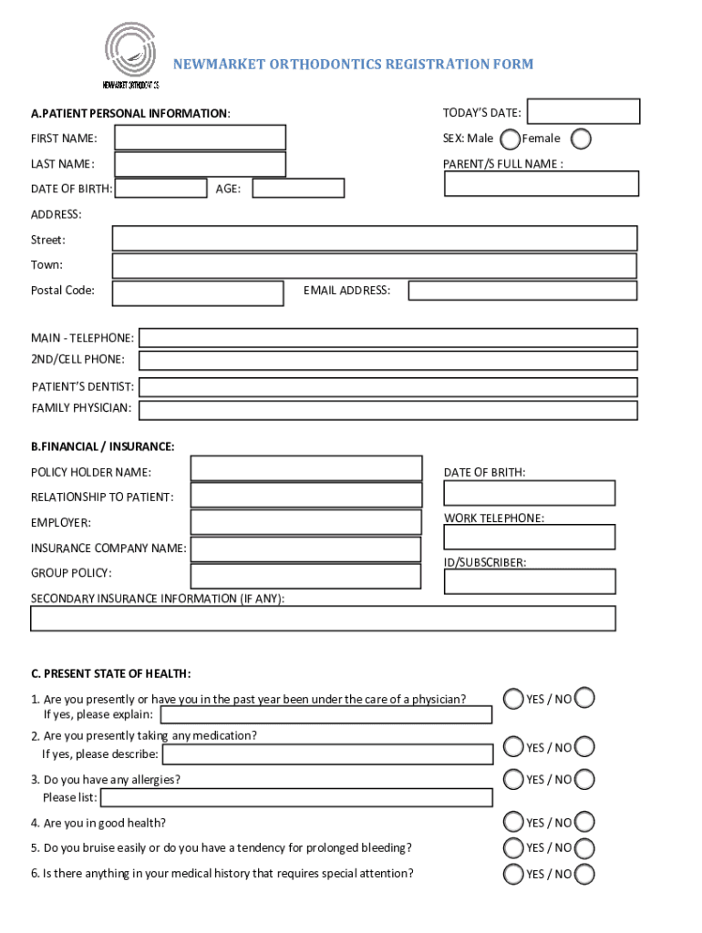 NEWMARKET ORTHODONTICS REGISTRATION FORM A.PATIENT PERSONAL INFORMATION:TODAYS DATE:FIRST NAME:SEX: Ballast NAME:PARENT/S FULL NAME :DATE OF BIRTH:Female AGE:ADDRESS: Street: Town: Postal Code:EMAIL