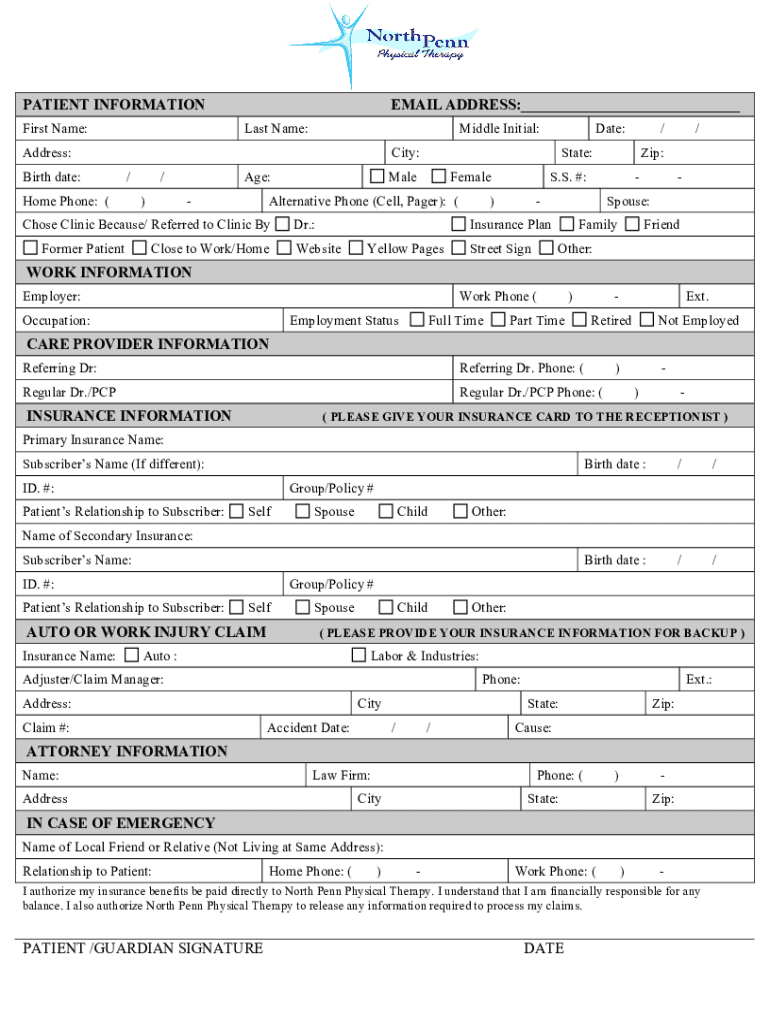 PATIENT INFORMATION First Name:EMAIL ADDRESS: Last Name:Middle Initial:Address: Birth date:Date:City: /Home Phone: (/)Age: Former PatientState:MaleFemaleAlternative Phone (Cell, Pager): (Chose Clinic