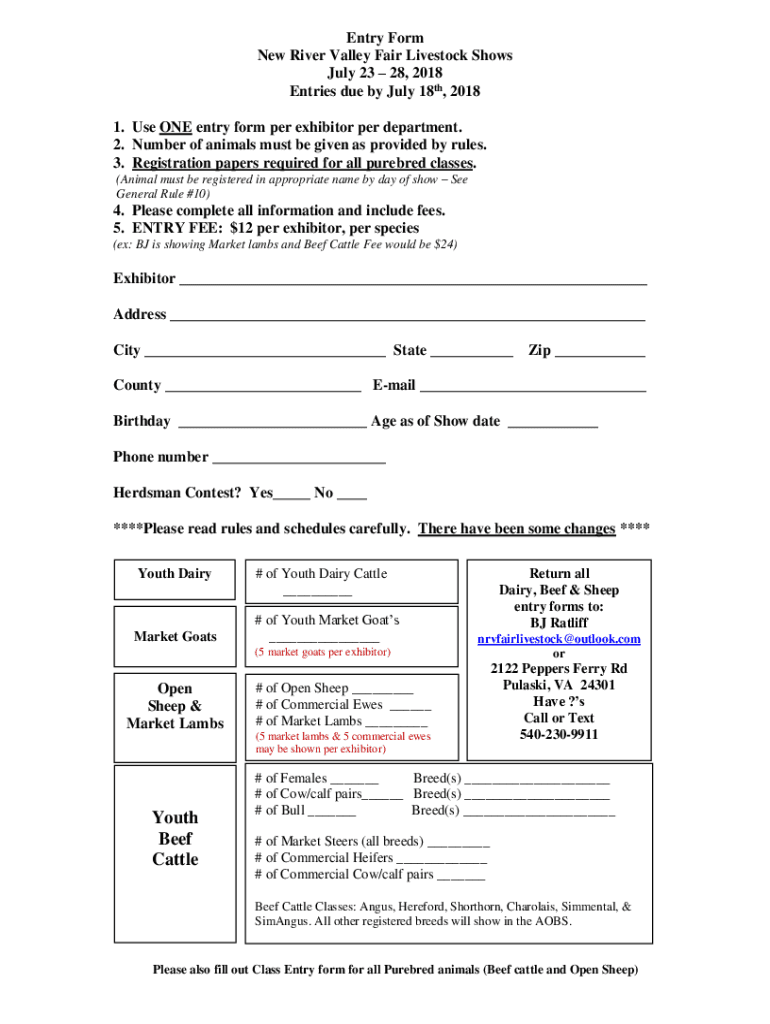 Entry Form New River Valley Fair Livestock Shows July 23 28, 2018 Entries due by July 18th, 2018 1. Use ONE entry form per exhibitor per department. 2. Number of animals must be given as provided