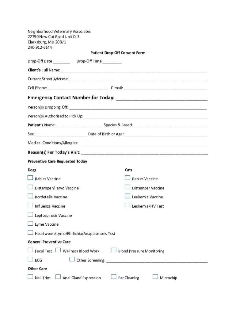 Neighborhood Veterinary Associates 22750 New Cut Road Unit D3 Clarksburg, MD 20871 2409126144 Patient Drop-off Consent Form Drop-off Date Drop-off Time Clients Full Name: Current Street Address: Cell