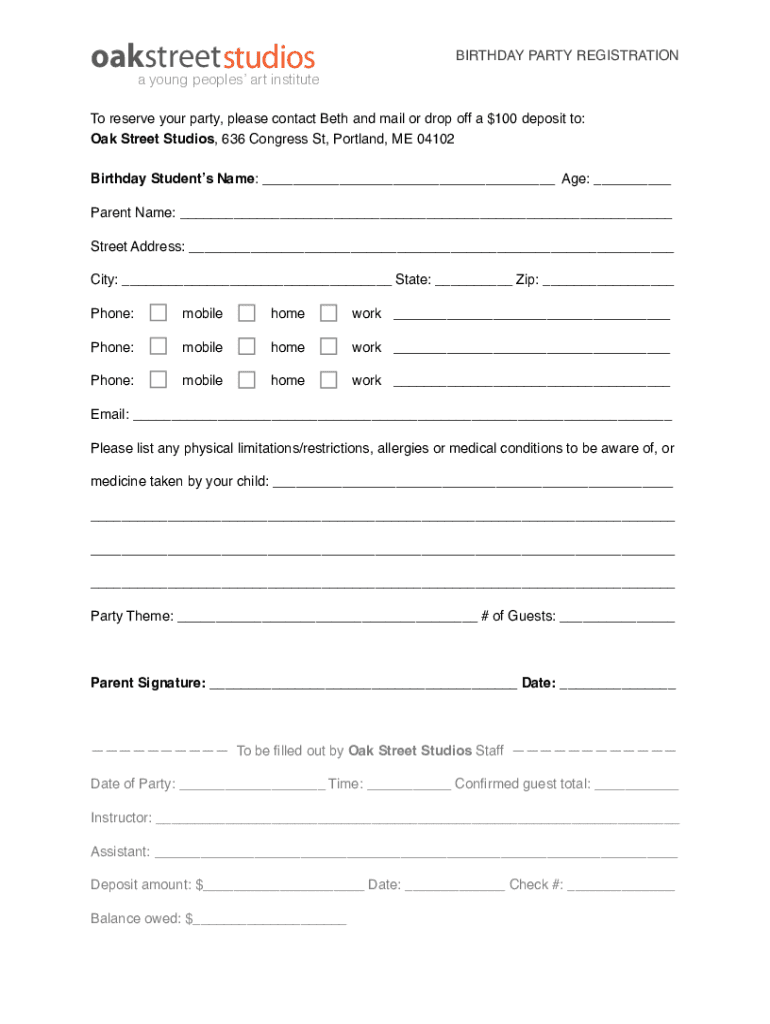 OakstreetstudiosBIRTHDAY PARTY Registration young peoples art institute reserve your party, please contact Beth and mail or drop off a $100 deposit to: Oak Street Studios, 636 Congress St, Portland,