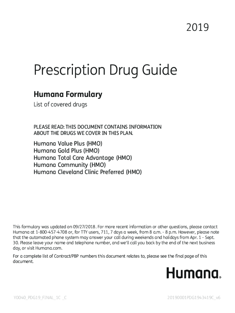 2019Prescription Drug Guide Human Formulary List of covered displease READ: THIS DOCUMENT CONTAINS INFORMATION ABOUT THE DRUGS WE COVER IN THIS PLAN. Human HumanaValue Plus (HMO) Gold Plus (HMO) Total
